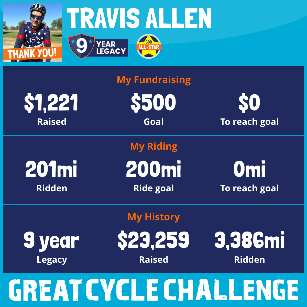 Please visit my donation page at https://greatcyclechallenge.com/Riders/TravisAllen/v to contribute today and your contribution will be matched by others who support this cause and in effect doubling it. Your support is greatly appreciated and will continue the important mission of the Children's Cancer Research Fund to find a cure for childhood Cancer.