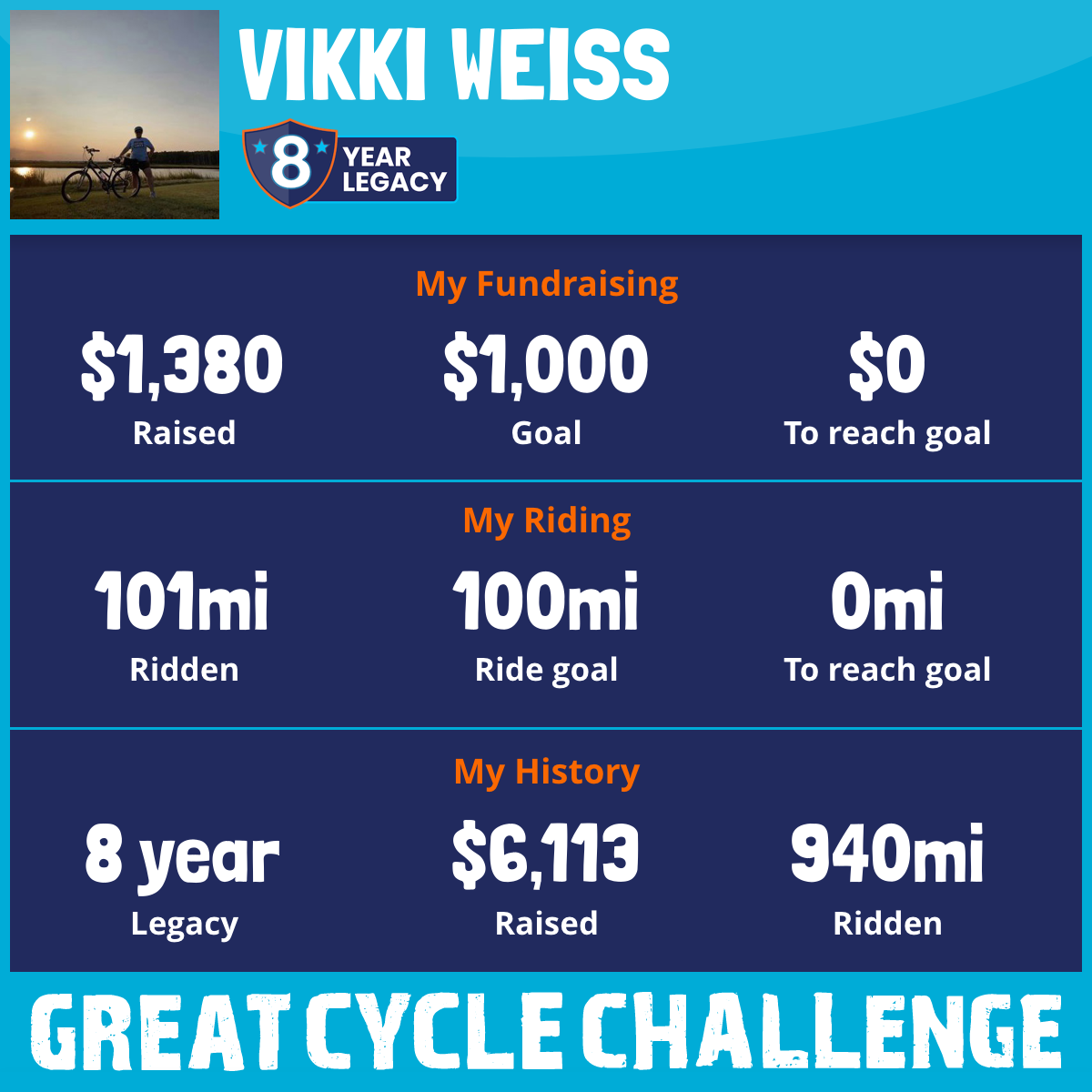 I am riding 100 mi in memory of Wes, Ava, Mark, Emma, Viv, Omar, Allie, Dad and so many more who are bravely fighting their battles!. Please sponsor me and support my challenge to fight kids' cancer and save little lives.