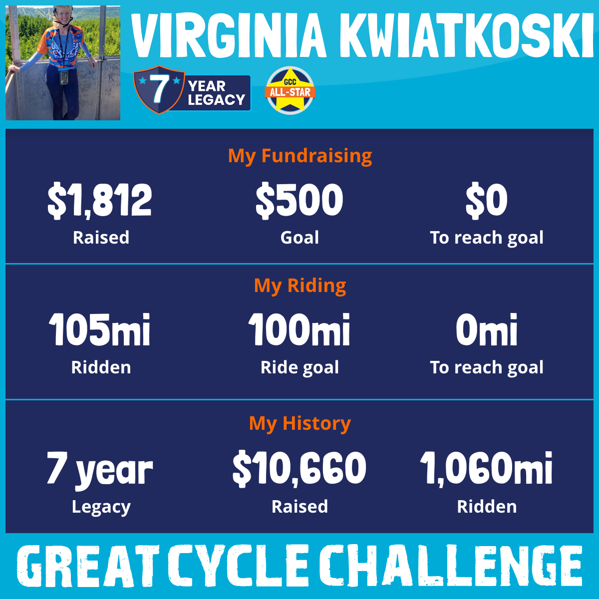 This September, I am gearing up to complete 100 miles on my bike to take part in the Great Cycle Challenge to fight kids' cancer! This is my 7th year participating in this challenge and I continue to believe in this cause.