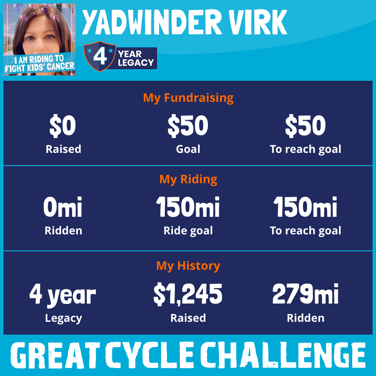 I am riding 150 mi for Yadi. Please sponsor me and support my challenge to fight kids' cancer and save little lives.