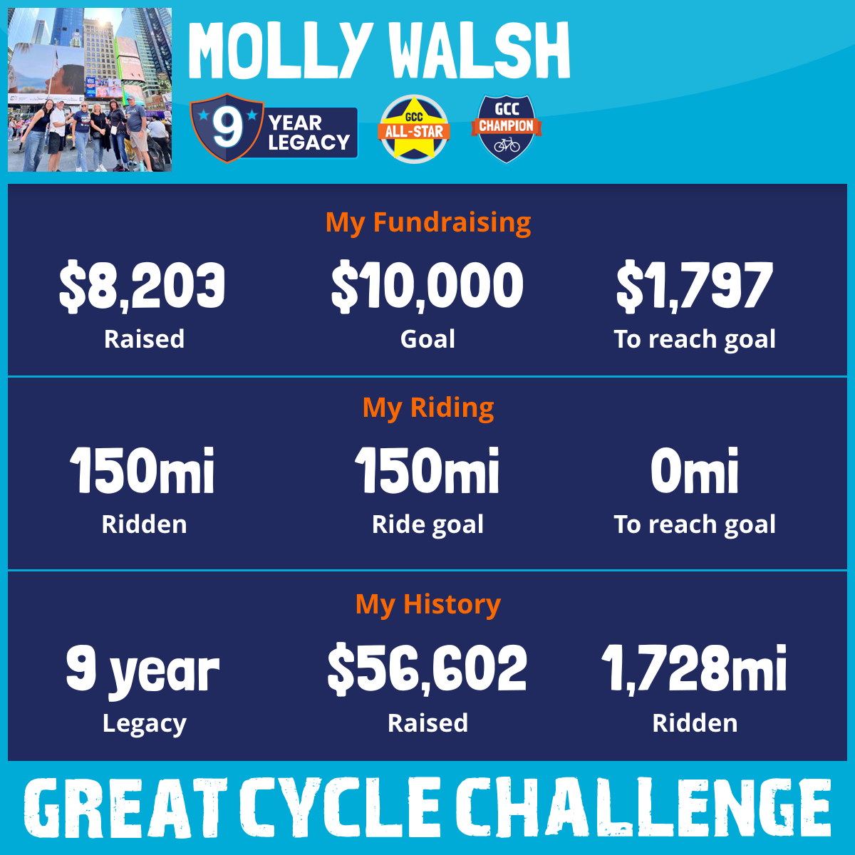Over the past 9 years, with the help of generous supporters, I’ve ridden 1,587 miles and raised over $56,653.98 to fund life-saving research, develop safer and more effective treatments, and bring us closer to finding cures for all childhood cancers.