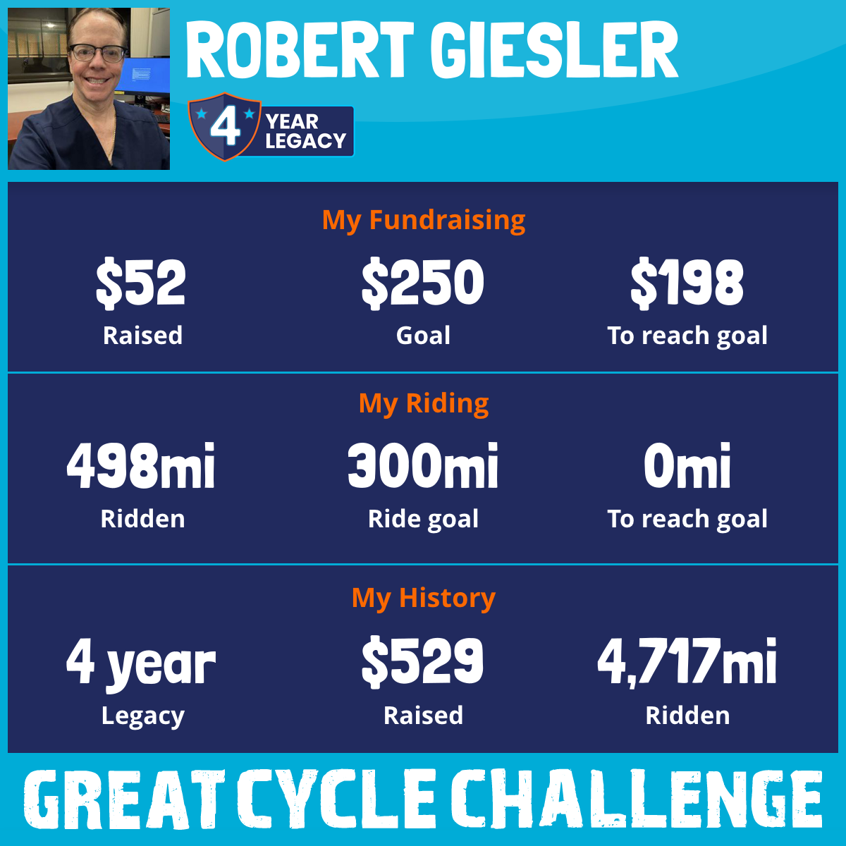 I am riding 300 mi in memory of my dad, Chuck Giesler. Please sponsor me and support my challenge to fight kids' cancer and save little lives.