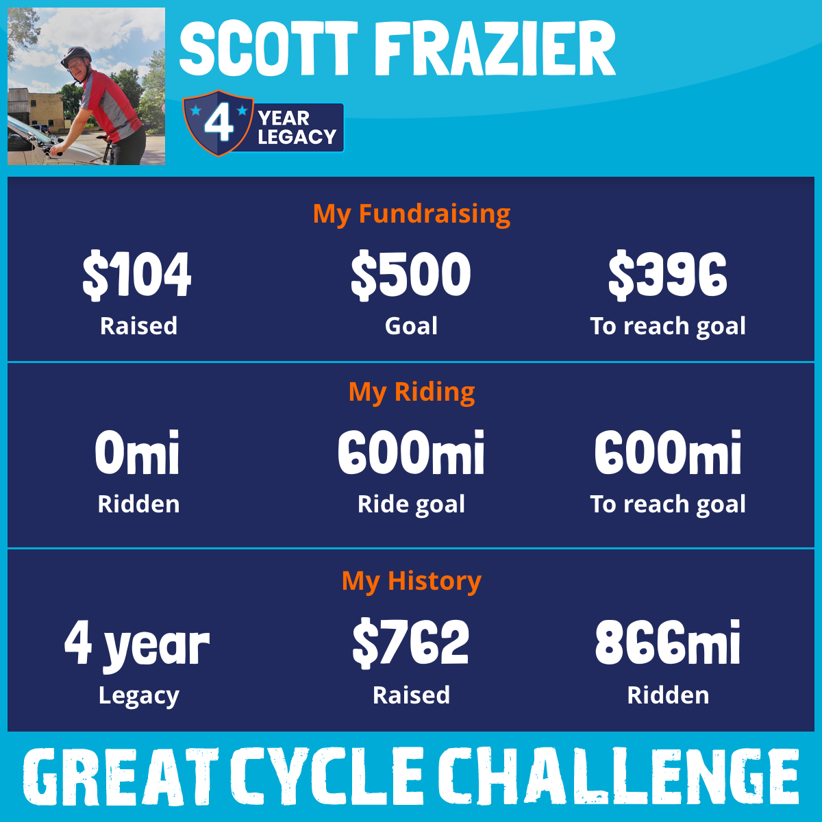 I am riding 600 mi in memory of my loved one, MaryLou. Please sponsor me and support my challenge to fight kids' cancer and save little lives.