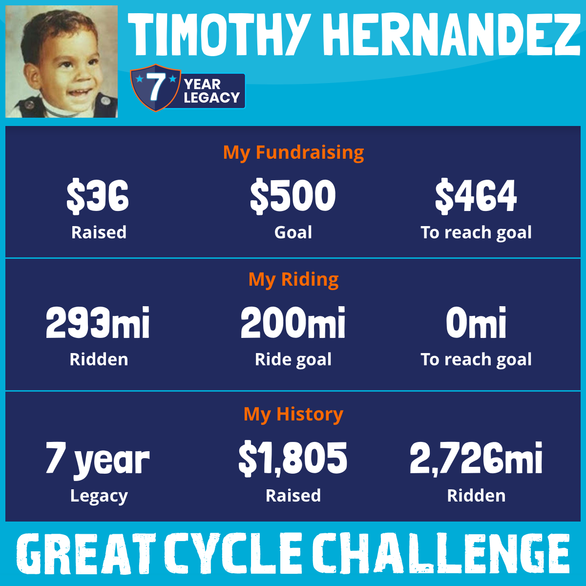 In June 2019, I completed the Great Cycle Challenge to fight kids' cancer. I've done the same every year since then. I've pledged to ride 200 miles in 30 days in memory of my cousin, Michelle Sullivan, who survived childhood leukemia but endured many other health challenges throughout her short life.